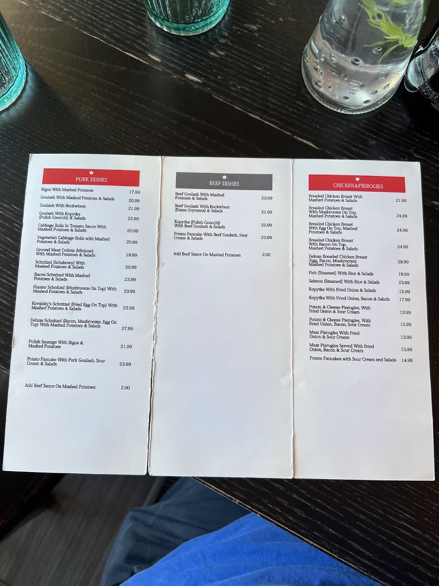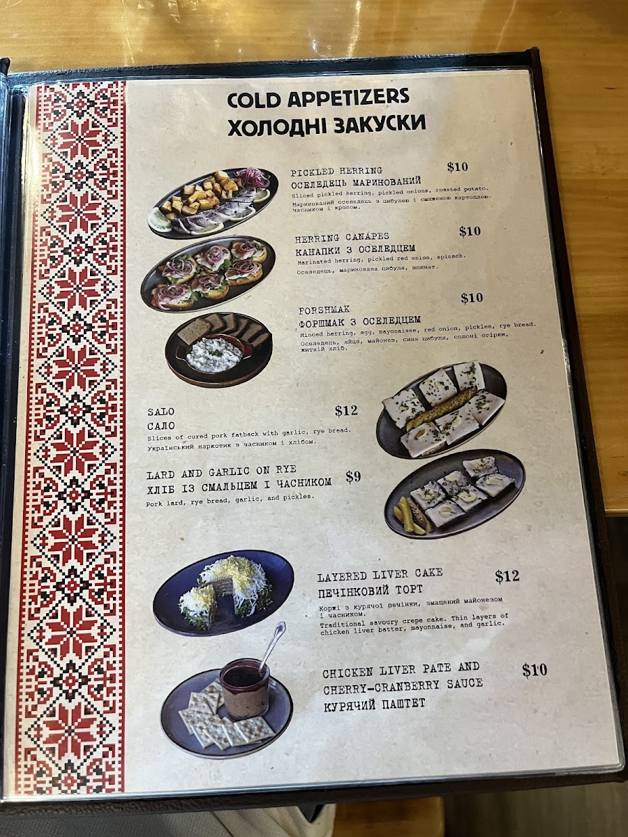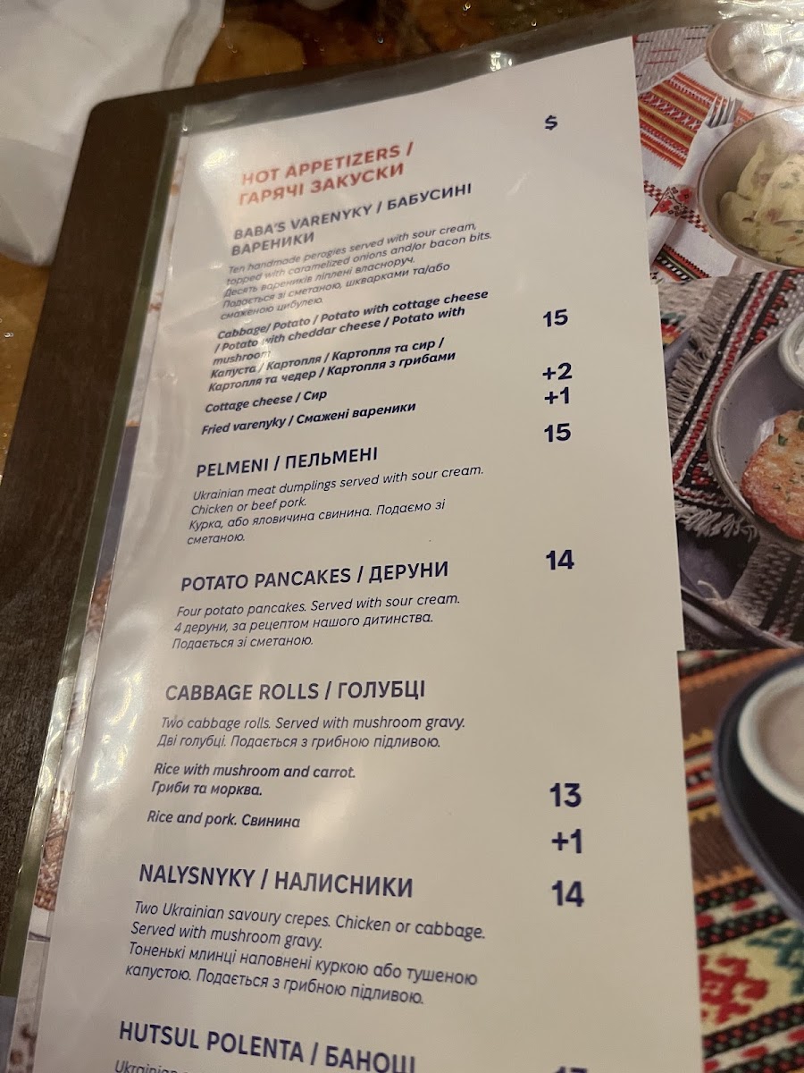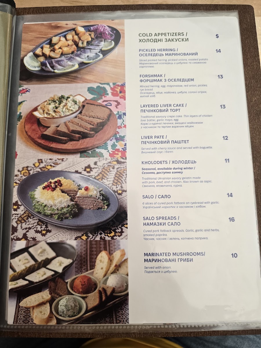 - Appetizers: This section includes classic starters such as cabbage rolls served with sour cream, polenta topped with feta cheese or bacon bits, pickled herring accompanied by roasted potatoes, and homemade varenyky with caramelized onions or bacon bits.