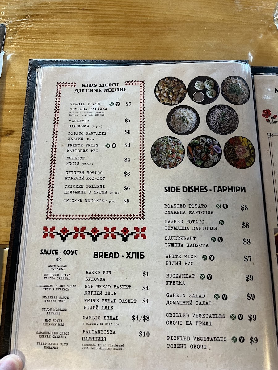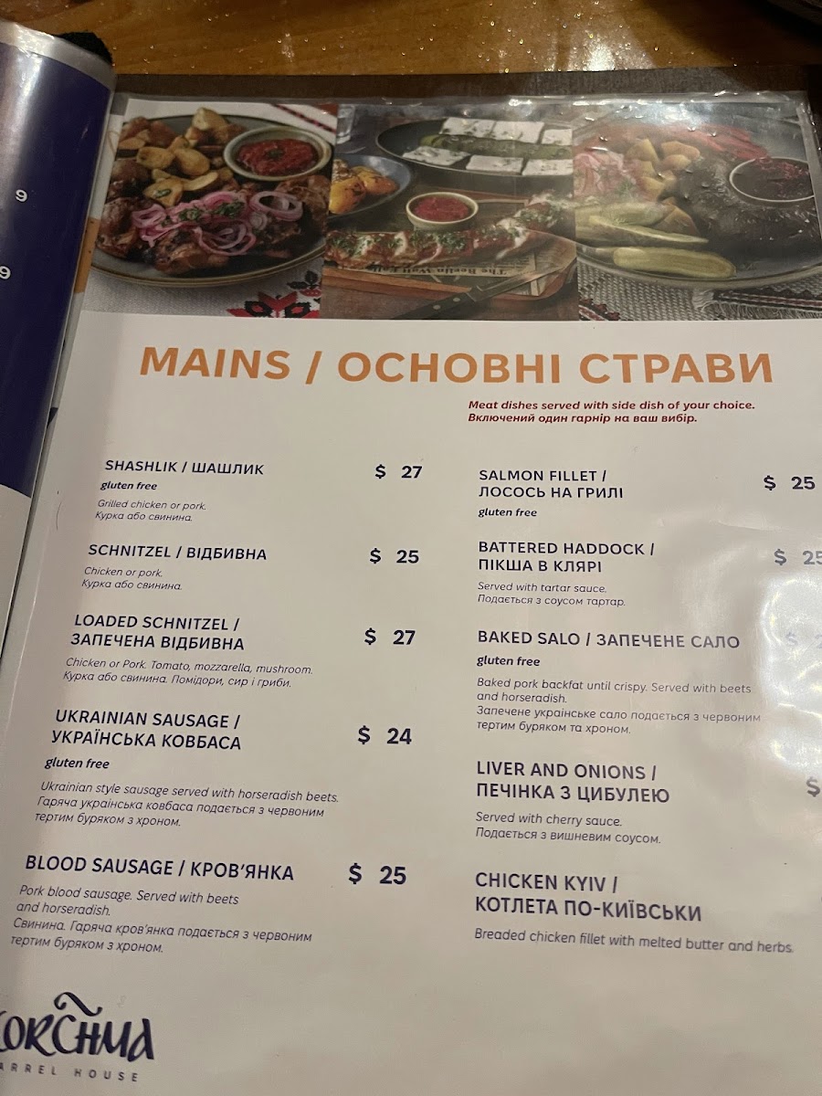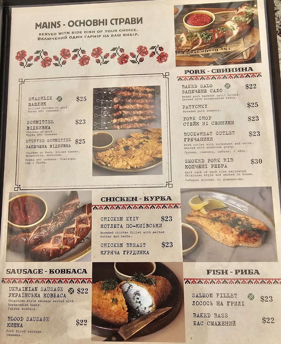 - Mains: Main courses feature options such as blood sausage served with a side dish, a sausage platter with assorted varieties and pickles, grilled salmon, the family platter combining chicken and pork shashlik with smoked ham and other meats, and chicken Kyiv.