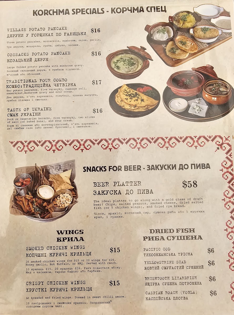 The menu at Barrel House Korchma offers a variety of traditional Ukrainian dishes, organized into several key categories to suit different dining preferences. Visitors can explore appetizers, soups, mains, and specialty platters, all featuring authentic ingredients and preparations.