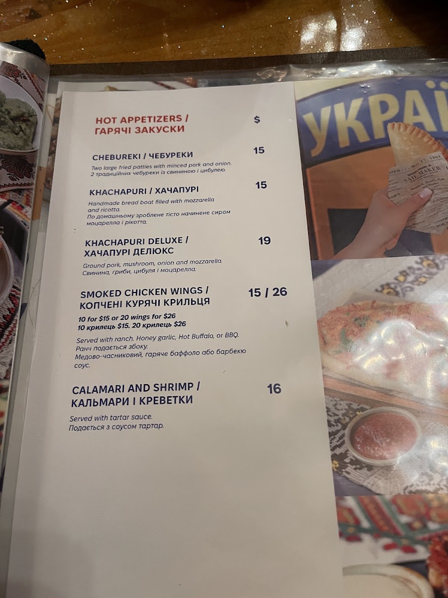 - Specialty Items and Platters: The menu highlights include potato pancakes, pork shashlik, pickled vegetables, rye bread with lard and garlic, sauerkraut, taster plates, and a selection of traditional dishes like borscht and chicken pelmeni.